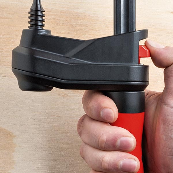 Mit der neuen BESSEY GearKlamp wurde eine Getriebezwinge entwickelt um auch an sonst schwer zugänglichen Stellen einfacher spannen zu können. Der Griff ist von der Spindel getrennt und wurde um die Schiene herum positioniert – was ein bequemes und kraftvolles Spannen mit der Getriebezwinge GearKlamp ermöglicht. Durch den Einsatz hochwertiger Materialien wie glasfaserverstärktem Polyamid für das Ober- und Unterteil sowie vergütetem und brüniertem Stahl für die Hohlprofilschiene. Zudem ermöglicht der 2-Komponenten Kunststoffgriff eine sichere Handhabung beim Spannen.