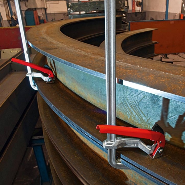 Eine optimierte Profilform ermöglicht mit großen Kraftreserven einen gleichmäßigen Spannkraftaufbau und dies insbesondere bei voller Ausnutzung der Spannweite. Der Festbügel der Zwinge wurde aus einem Stück geschmiedet hat eine angeformte Druckplatte, ist vergütet und verzinkt wodurch sie hochbelastbar und verwindungssteif ist.