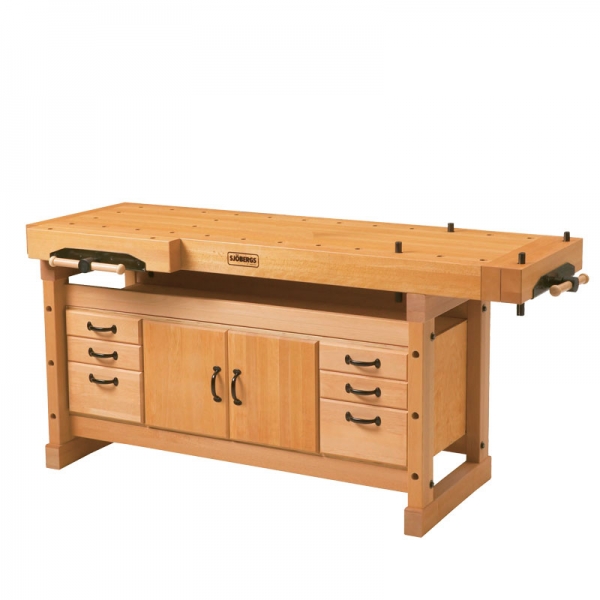 Die Sjöbergs Hobelbank Elite 2000 ist meisterhaft und stark in Qualität und Ausführung. Diese schwedische Hobelbank überragt nicht nur dank ihrer mustergültigen Verarbeitung sondern auch mit ihrem strammen Gewicht alle vergleichbaren Modelle! Die Elite Hobelbänke werden nach alter schwedischer Handwerkstradition, verbunden mit modernsten Erkenntnissen der Holzverarbeitung hergestellt. Die Konstruktion massiv in Buche. Die Kernstärke der fein geölten Arbeitsplatte beträgt 85 mm, die Stärke der Vorderkante 110 mm. Die eigens für diesen Einsatz hergestellten Vorderzangen entwickeln bei einer Länge von 600 mm eine enorme Spannkraft. Spanngeschwindigkeit, Genauigkeit und gleichmässige Funktion überzeugen jeden Praktiker. In weniger als zwei Minuten kann die Vorderzange, ganz nach Bedarf – etwa für Linkshänder – auch an der jeweiligen Seitenfront angebracht werden. Ausgehend von der parallel spannenden Zangen-Anordnung ist die Platte mit einer doppelten Bankhakenreihe für je 25,4 mm runde Bankhaken versehen. Mit der Schnellspannzwinge QSH, die nicht nur in die Bankhakenreihe, sondern auch in die Vorderbeine (Bankknecht) passt, lässt sich jedes Werkstück in Sekundenschnelle packen. Die Zangen der Elite 2000 sind massiv mit einer Grösse von 740 mm. Öffnungsweite 145 mm.