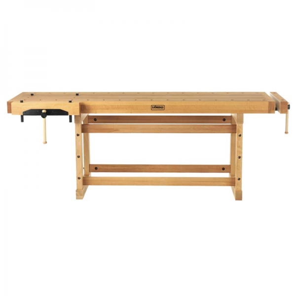 Die Sjöbergs Hobelbank Elite 2500 ist meisterhaft und stark in Qualität und Ausführung. Diese schwedische Hobelbank überragt nicht nur dank ihrer mustergültigen Verarbeitung sondern auch mit ihrem strammen Gewicht alle vergleichbaren Modelle! Die Elite Hobelbänke werden nach alter schwedischer Handwerkstradition, verbunden mit modernsten Erkenntnissen der Holzverarbeitung hergestellt. Die Konstruktion massiv in Buche. Die Kernstärke der fein geölten Arbeitsplatte beträgt 85 mm, die Stärke der Vorderkante 110 mm. Die eigens für diesen Einsatz hergestellten Vorderzangen entwickeln bei einer Länge von 600 mm eine enorme Spannkraft. Spanngeschwindigkeit, Genauigkeit und gleichmässige Funktion überzeugen jeden Praktiker. In weniger als zwei Minuten kann die Vorderzange, ganz nach Bedarf – etwa für Linkshänder – auch an der jeweiligen Seitenfront angebracht werden. Ausgehend von der parallel spannenden Zangen-Anordnung ist die Platte mit einer doppelten Bankhakenreihe für je 25,4 mm runde Bankhaken versehen. Mit der Schnellspannzwinge QSH, die nicht nur in die Bankhakenreihe, sondern auch in die Vorderbeine (Bankknecht) passt, lässt sich jedes Werkstück in Sekundenschnelle packen. Die Zangen der Elite 2500 sind massiv mit einer Grösse von 740 mm. Öffnungsweite 145 mm.