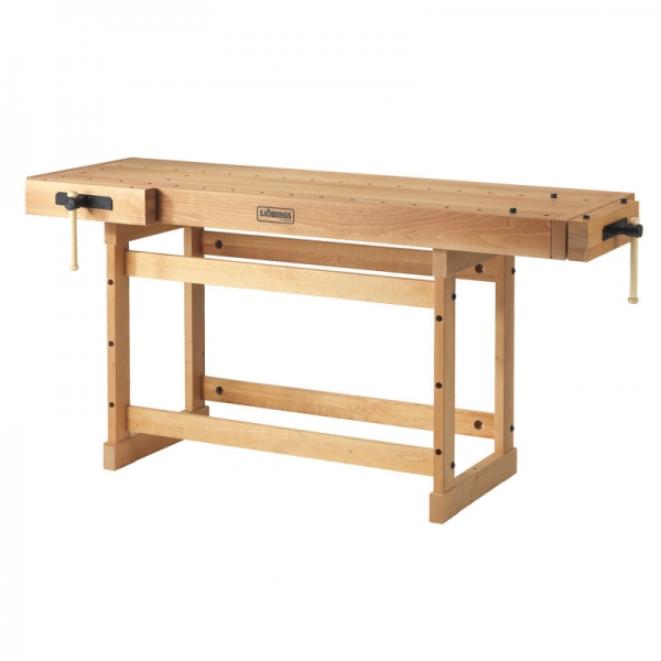 Die Arbeitsplatte ist aus massiv verleimter Buche, geölt, und haben eine parallel spannende Vorder- / Hinterzange mit doppelter Zangenführung. Die Platte ist doppelt senkrecht als auch waagerecht gelöchert für vier Bankhaken. Die Bankhaken-Löcherung ist auch für den Einsatz unserer Spannzwingen geeignet. Vier Bankhaken von 19,05 mm sind stets Teil des Lieferumfanges. Die Bankhaken sind rund und fassen auch unregelmäßige Werkstücke.
